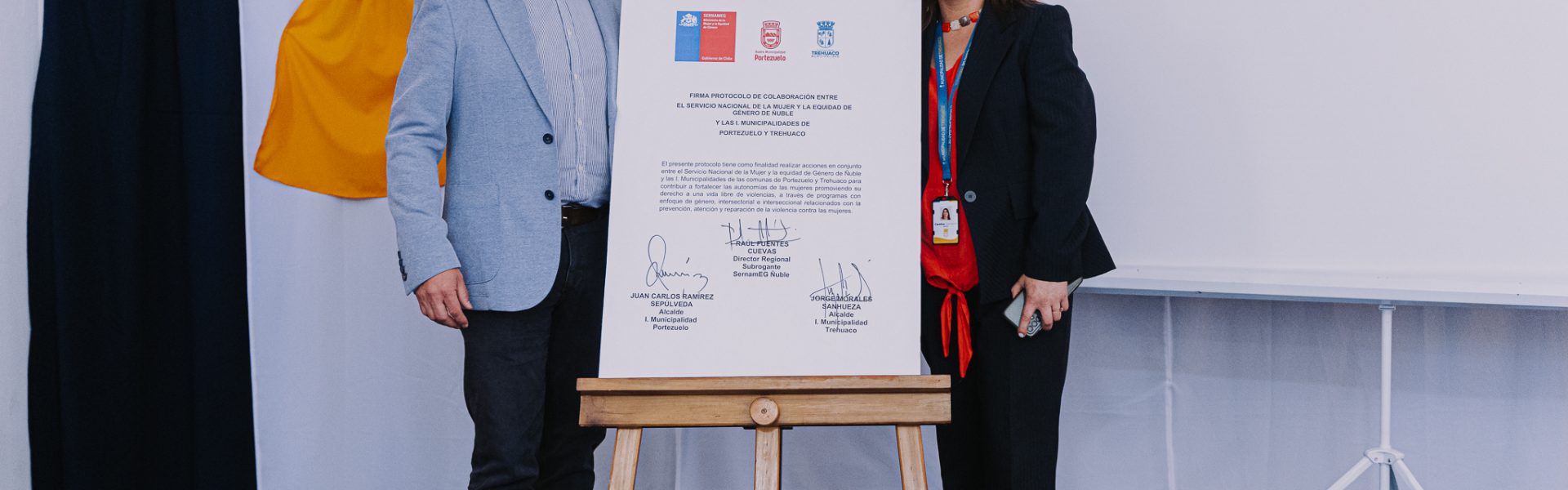 La jornada cont贸 con la participaci贸n de nuestro alcalde, Jorge Morales; alcalde de la comuna de Portezuelo Juan Carlos Ram铆rez ; director regional (s) del Servicio Nacional de la Mujer y la Equidad de G茅nero de 脩uble, Ra煤l Fuentes Cuevas; as铆 como de concejales de la comuna, quienes manifestaron su respaldo y compromiso con esta relevante iniciativa.