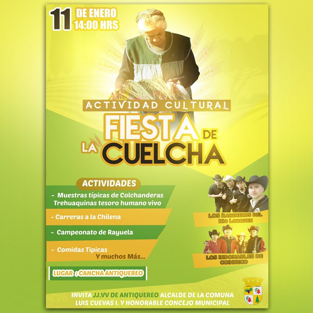 Se invita a toda la comunidad y alrededores, a participar de la Fiesta Costumbrista de la Cuelcha a desarrollarse este sábado 11 de enero desde las 14.00 HRS en la sede de la Junta de Vecinos de Antiquereo.