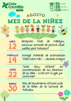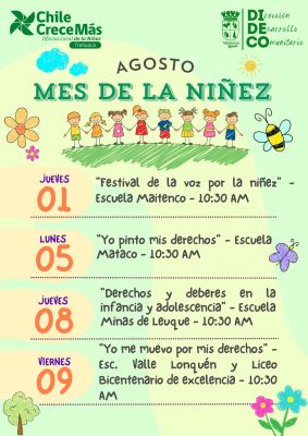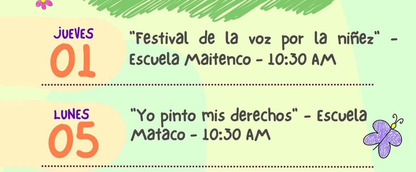 En conmemoración de los derechos de los niños, niñas y adolescentes, el alcalde Raúl Espejo Escobar y el Honorable Concejo Municipal, te invitan a ser parte de estas actividades, diseñadas con mucho cariño para todos los niños, niñas y adolescentes de nuestra comuna. ![]()