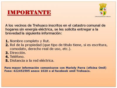 Los vecinos que se inscribieron en el catastro comunal de viviendas sin energía eléctrica, deben comunicarse con el municipio para verificación de datos, si usted no alcanzó a inscribirse, solicite su incorporación al listado a la brevedad. Esta información la está solicitando el Ministerio de Energía.