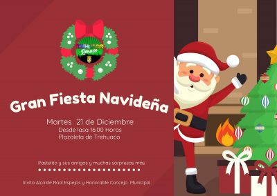 La ilustre Municipalidad de Trehuaco encabezada por el alcalde Raul Espejo Escobar, invita a todas las niñas y niños de nuestra Comuna a la gran fiesta de navidad. Contaremos con el show del payaso pastelito y sus amigos y muchas sorpresas más los esperamos el martes 21 de diciembre a contar de las 16:00 horas en la plazoleta de nuestra Comuna.