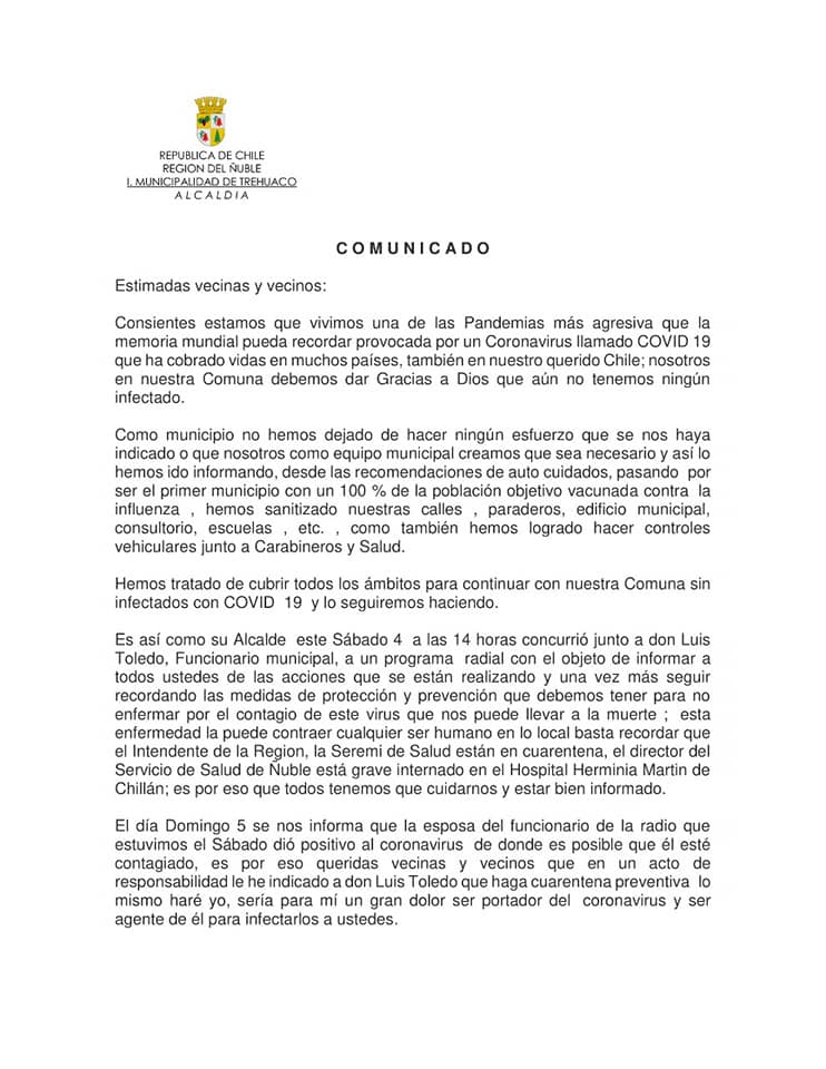El Municipio de Trehuaco informa a la comunidad lo siguiente.