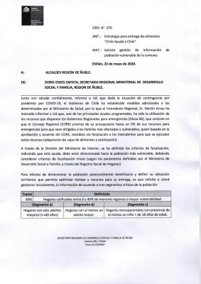 1. Que el día de ayer viernes pasada las 20.00 HRS. se recibe Ordinario N° 370 por parte de la Intendencia Regional de Ñuble solicitando información segmentada de la población vulnerable de la Comuna. para la entrega de canastas familiares.